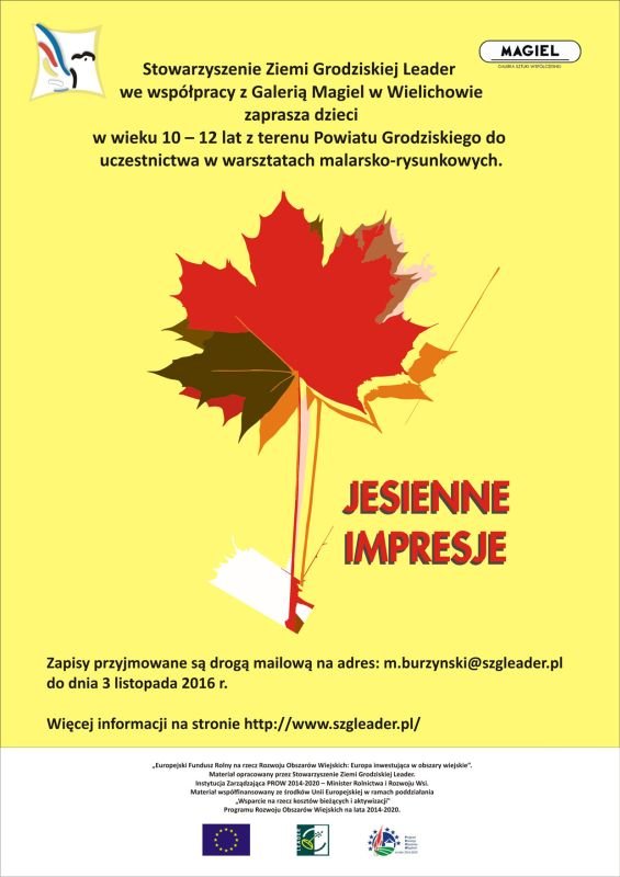 Leader - Stowarzyszenie Ziemi Grodziskiej we współpracy z Galerią Magiel w Wielichowie ogłasza zapisy dla dzieci w wieku 10 - 12 lat z terenu Miasta i Gminy Wielichowo do uczestnictwa w warsztatach malarsko - rysunkowych pt.: "Jesienne impresje".