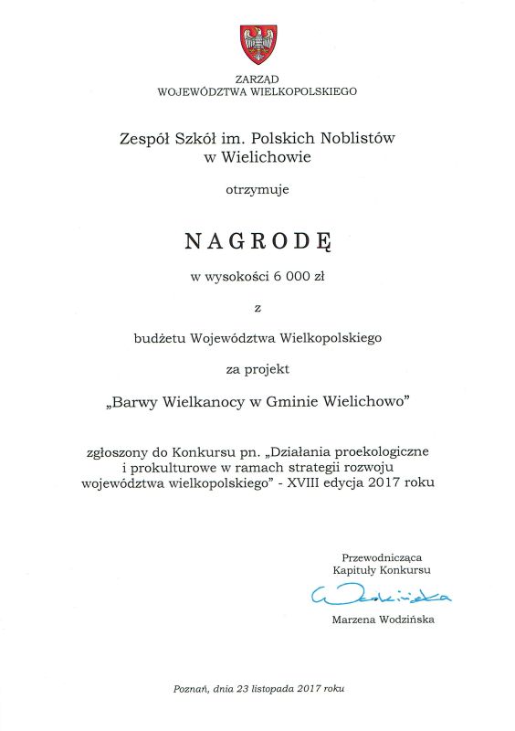 Wśród laureatów tegorocznej edycji znalazła się nasza szkoła, którą wyróżniono za projekt pt. „Barwy Wielkanocy w Gminie Wielichowo" i nagrodzono finansowo kwotą 6 tysięcy zł z budżetu Województwa Wielkopolskiego. Szkołę Podstawową im. Polskich Noblistów w Wielichowie reprezentowały: wicedyrektor Gabriela Ślusarczyk oraz Renata Kurpisz, które z rąk wicemarszałka Województwa Wielkopolskiego Marzeny Wodzińskiej odebrały gratulacje oraz nagrodę.
