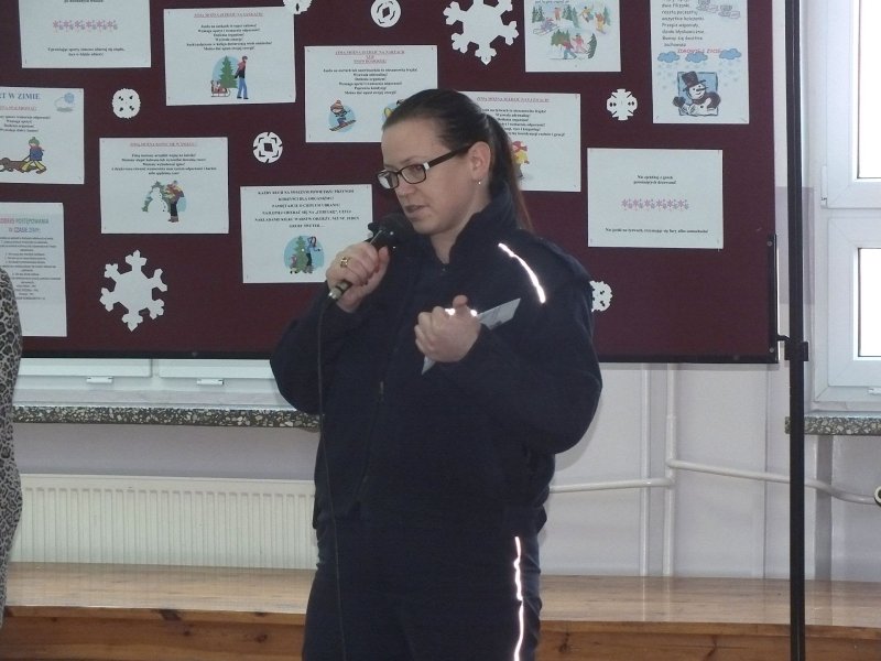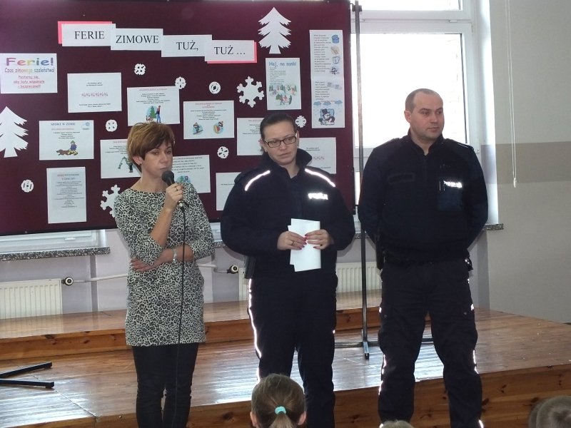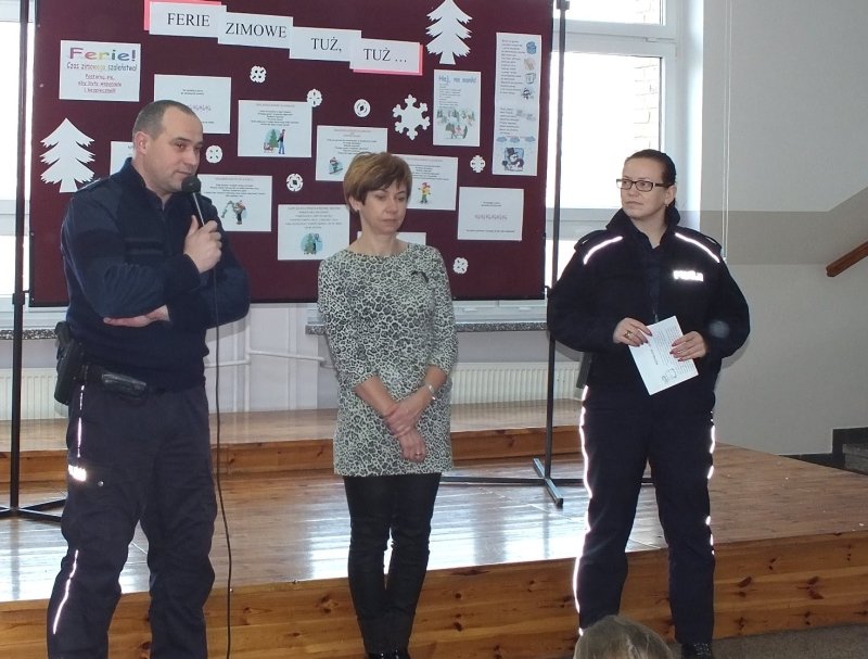 W ramach działań profilaktycznych dnia 23.01. odbyło się w naszej szkole spotkanie dotyczące „BEZPIECZEŃSTWA W CZASIE  FERII ZIMOWYCH’’. Ciekawych i cennych informacji na temat bezpiecznych zachowań wysłuchali uczniowie kl. IV-VI S.P, oraz uczniowie  Gimnazjum.  Najistotniejszym zagadnieniem spotkania było niebiezpieczeństwo zabaw na lodzie, które każdego roku zbiera żniwo śmiertelnych utonięć dzieci. Pogadankę przeprowadziła pielęgniarka Alina Patelka wraz z policjantem.