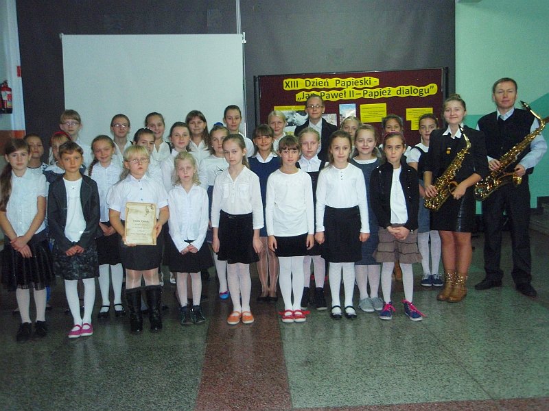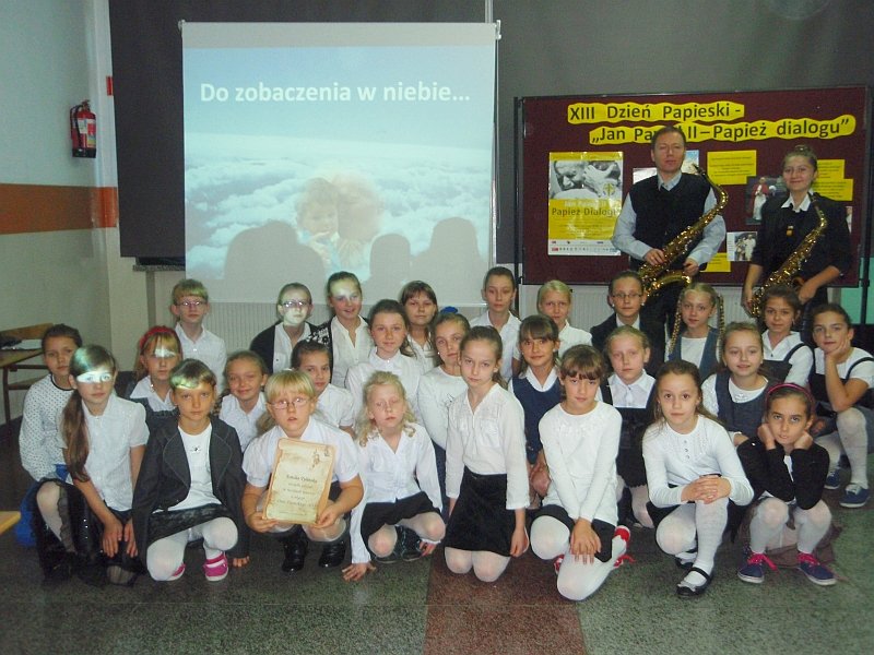 W tym roku Dzień papieski obchodzony był pod hasłem: „Jan Paweł II- Papież dialogu”. Podobnie jak w latach ubiegłych uczciliśmy ten dzień uroczystym apelem. W szkole podstawowej odbył się on w środę 23 października 2013r. Uczniowie recytowali wiersze o Janie Pawle II Zaczerpnięto je ze „Szkolnego Tomiku Wierszy o Janie Pawle II” opublikowanego na stronie szkoły- Gimnazjum nr 1 w Rabce Zdroju. Wszystkie te wiersze napisali młodzi ludzie z owego gimnazjum. Oprócz wierszy przy pomocy prezentacji multimedialnej uczniowie mogli lepiej zrozumieć, co to znaczy, że Jan Paweł II nazywany był mistrzem dialogu! Nie zabrakło także piosenek w wykonaniu szkolnego chórku z akompaniamentem dwóch saksofonów: altowego na którym grała uczennica Agata Frąckowiak oraz tenorowego, na którym grał pan Leszek Rombel. Całość dopełniło końcowe słowo Pani dyrektor Bogumiły Andrzejewskiej, która podziękowała uczniom za przygotowanie tego apelu oraz zachęcała do podejmowania niezwykle trudnej sztuki dialogu w życiu codziennym. Na koniec Pani Dyrektor wręczyła uczniom recytującym wiersze - pamiątkowe dyplomy.
