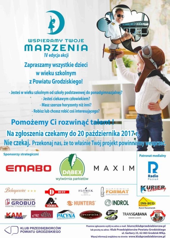 Rusza IV edycja akcji "Wspieramy Twoje marzenia". W imieniu Klubu Przedsiębiorców Powiatu Grodziskiego zapraszam Was Drodzy Uczniowie do wzięcia udziału w niej. Co trzeba zrobić? Przedstawić swój talent, swoje zainteresowania i napisać co potrzebujecie, aby go dalej rozwijać. Zgłoszenie można wysłać w formie listu lub e-maila. Termin nadsyłania zgłoszeń mija 20 października 2017r.