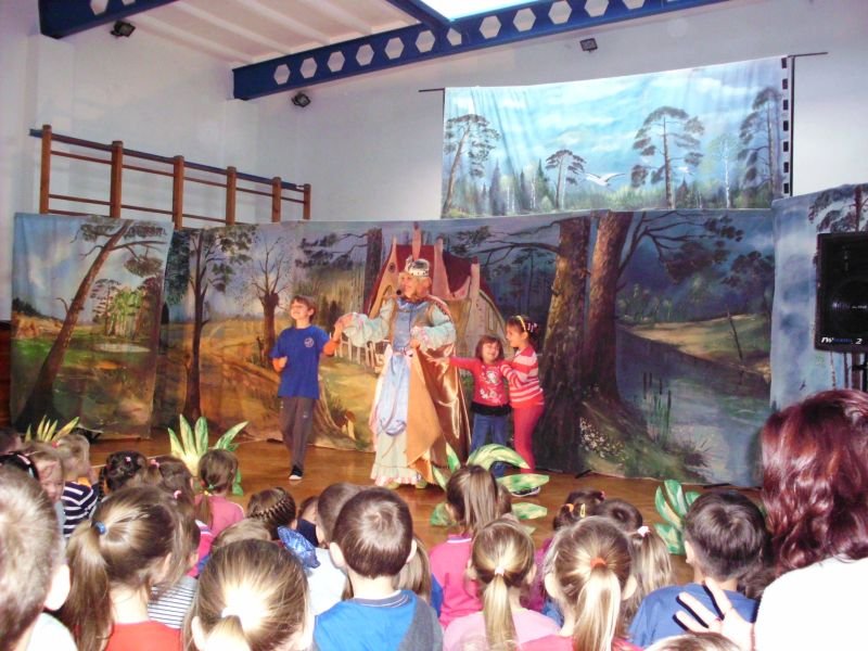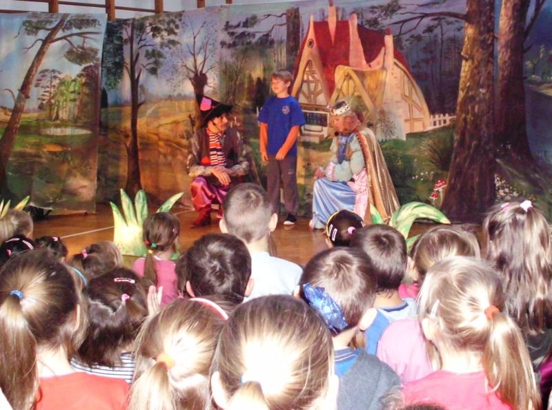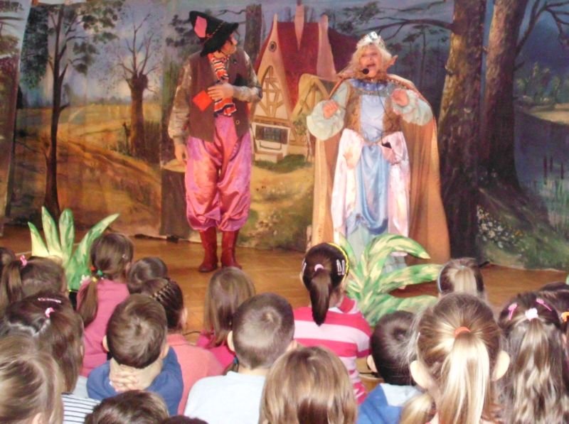 W miniony wtorek najmłodsi uczniowie naszej szkoły mieli możliwość uczestniczenia w przedstawieniu „Podróż w Krainę Baśni”. Poznawali nowe, ciekawe przygody znanych baśniowych bohaterów. Doskonale rozróżniali pojawiające się postacie pozytywne i negatywne. Żywo reagowali na obserwowany przebieg wydarzeń. Klaskali do rytmu śpiewanych piosenek. Odważnie i głośno ostrzegali niektórych bohaterów o czyhającym na nich niebezpieczeństwie. Podczas komicznych wątków przedstawienia cała sala rozbrzmiewała wesołym śmiechem. Kilkoro uczniów mogło również stać się przez chwilę aktorem i zagrać rolę np. księcia, który pocałunkiem wybudza ze snu królewnę.