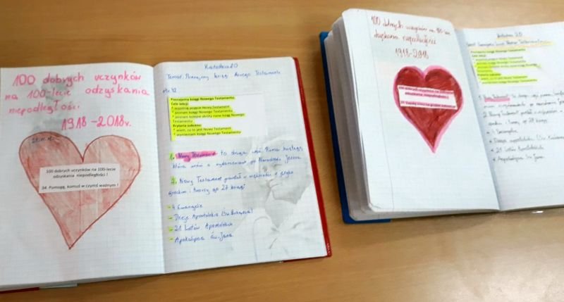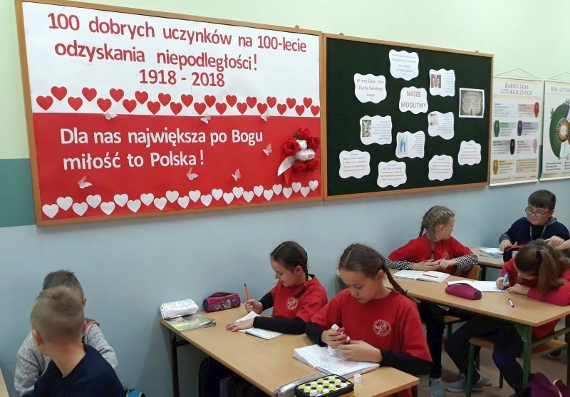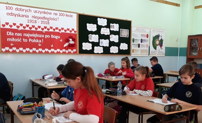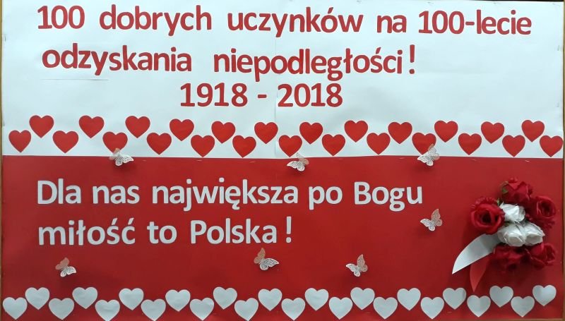 Wśród różnych inicjatyw i działań podejmowanych przez Szkołę Podstawową im. Polskich Noblistów w Wielichowie, a związanych z uczczeniem rocznicy odzyskania niepodległości znalazł swoje miejsce jeszcze jeden pomysł:100 dobrych uczynków na 100-lecie odzyskania niepodległości. Uczniowie klas 4 i 5 podjęli się realizacji 100 dobrych uczynków,wśród których znalazły się takie propozycje jak: zapal znicz na grobie żołnierza, pomódl się w intencji pokoju, pomóż słabszemu koledze/koleżance w nauce, pomóż rodzicom w obowiązkach domowych, pomódl się w intencji Ojczyzny i wiele innych. Wszystko po to, by pokazać, że nadal istnieją ludzie, którzy walczą o lepsze życie dla innych, słabszych i którzy udowadniają, że we wspólnocie jest siła. Współczesny patriotyzm najlepiej ukazywać przez konkretny czyn, stąd pomysł na taką właśnie akcję. Pomoc słabszym, biedniejszym, chorym czy samotnym to nasz podstawowy, ludzki obowiązek. Trudno ująć to celniej niż zrobił to Jan Paweł II, który mówił o tym, że człowiek jest wielki nie przez to, co ma, lecz przez to, czym dzieli się z innymi. I tej myśli starajmy się trzymać. Uczniowie klas 4 i 5 na lekcjach religii losowali dobre uczynki, przygotowane na białych i czerwonych karteczkach, wklejali je do zeszytu, a następnie wpisywali datę realizacji. Kiedy wszystkie dobre uczynki zostaną wykonane, powstanie najtrwalszy pomnik dla Niepodległej!