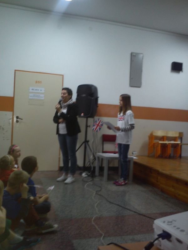 Wielką radość sprawiło uczniom wspólne śpiewanie angielskich piosenek. Kolejną atrakcją był quiz, a właściwie zabawa z językiem angielskim. Dwie drużyny złożone z przedstawicieli poszczególnych klas zmagały się z przygotowanymi zdaniami. Uczniowie mogli się wykazać znajomością słownictwa oraz umiejętnością wypowiadania się w języku angielskim.