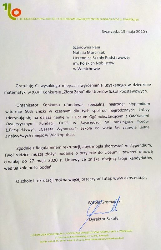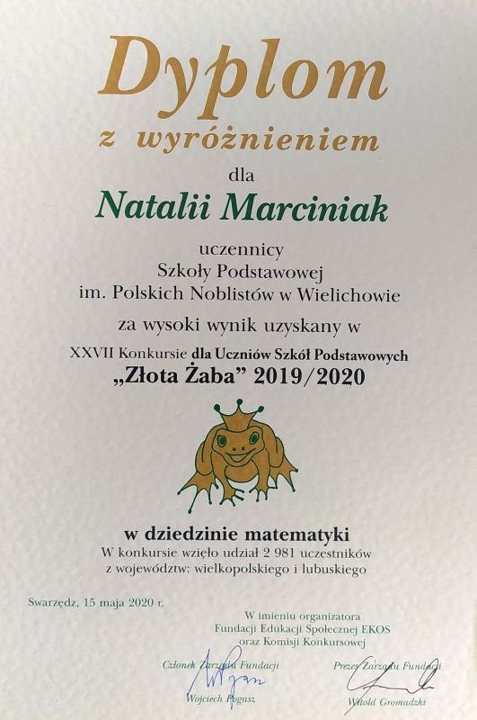 Uczennica klasy 8b Natalia Marciniak została wyróżniona w XXVII edycji konkursu matematycznego "Złota Żaba". Jest to konkurs organizowany dla uczniów szkół podstawowych przez Fundację Edukacji Społecznej EKOS ze Swarzędza. Ze względu na stan zagrożenia epidemicznego drugi etap konkursu, zaplanowany na marzec, nie mógł się odbyć. Organizatorzy rozwiązali ten problem w następujący sposób. Postanowili, że ze 126 uczestników, którzy zakwalifikowali się do drugiego etapu, wybrać uczniów z najwyższym wynikiem punktowym z pierwszej tury. Natalia zdobyła 80 na 100 możliwych punktów, co pozwoliło jej dostać się do grona wyróżnionych.