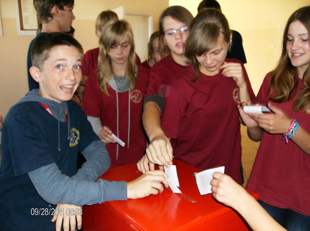 28 września odbyły się wybory do Samorządu Uczniowskiego. Głosowali wszyscy obecni w tym dniu gimnazjaliści. Każdy na liście kandydatów stawiał znak X przy czterech nazwiskach osób, które jego zdaniem powinny znaleźć się w Samorządzie Uczniowskim.