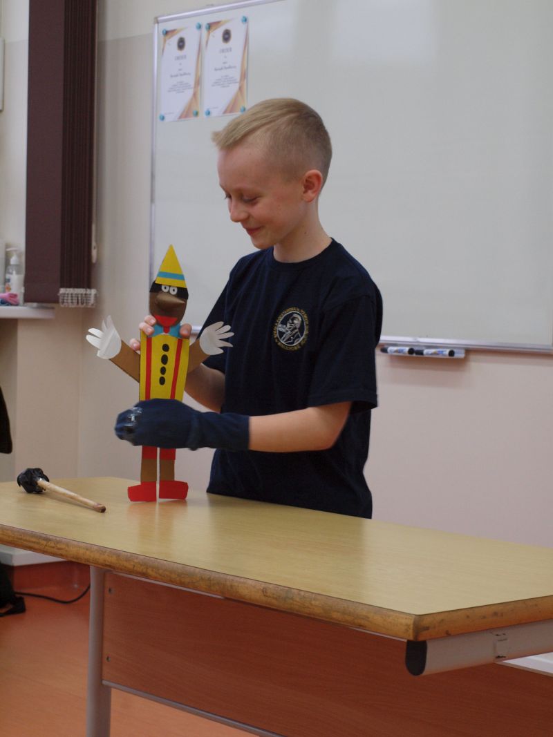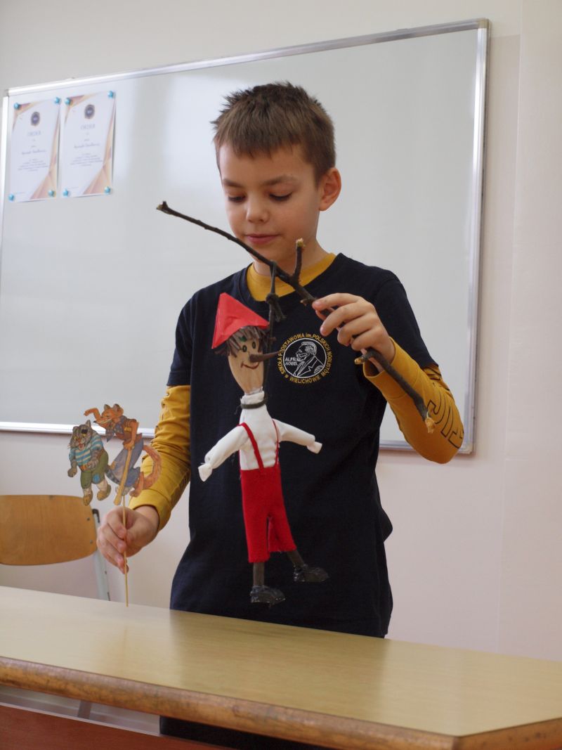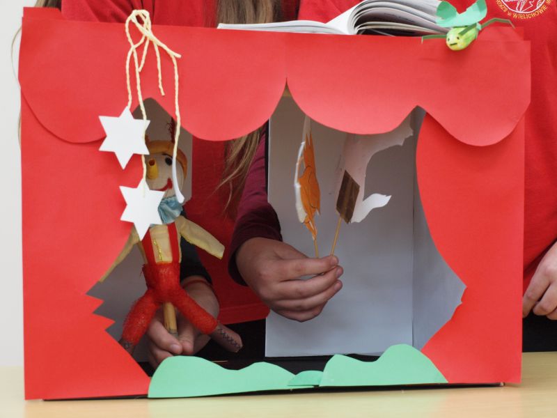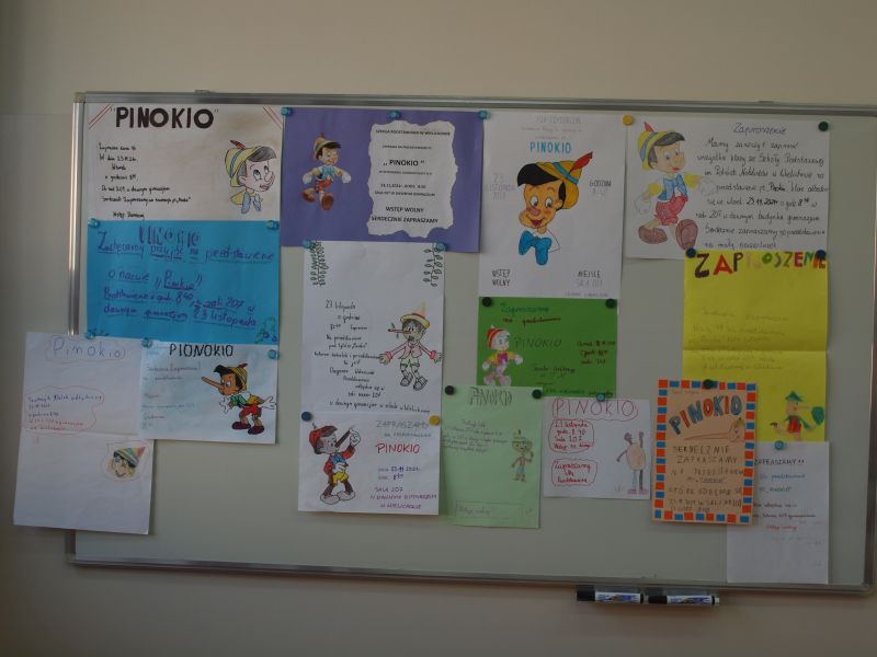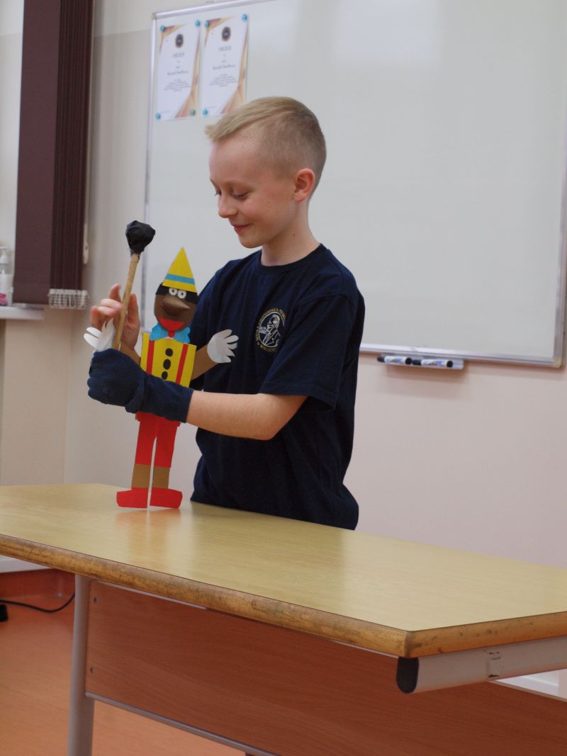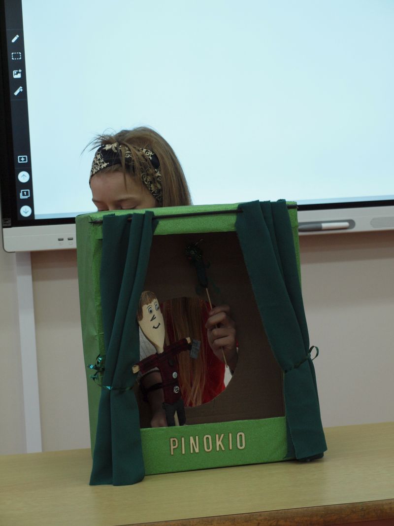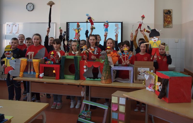 Książka C.Collodiego o drewnianym pajacu, który marzył o tym, by zostać prawdziwym chłopcem, bawi i inspiruje kolejne pokolenia młodych czytelników. Wśród nich znaleźli się także uczniowie klasy 4b Szkoły Podstawowej im. Polskich Noblistów. Każdy z nich przygotował sceniczną wersję, wybranego wcześniej przez siebie, fragmentu lektury. Oczywiście droga do ostatecznej prezentacji wiodła przez kilka etapów. Najpierw, uczniowie dowiedzieli się jak wygląda praca w teatrze animacji, jakie istnieją rodzaje lalek i jak może wyglądać spektakl z ich udziałem. Później, własnoręcznie przygotowali „aktorów” – wykorzystując przy tym bardzo różne techniki – oraz elementy scenografii. W dalszej kolejności powstały afisze oraz zaproszenia na spektakl, a właściwie kilkadziesiąt krótkich przedstawień.