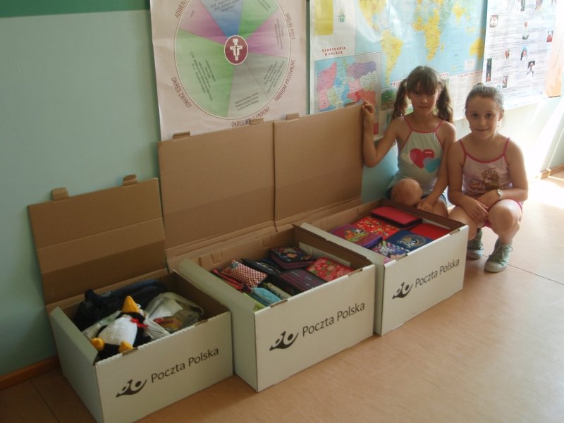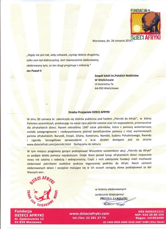Dar polskich dzieci dla afrykańskich kolegów i koleżanek trafił do: Burundi (Gatara i Bujumbura) 269 piórników Etiopii (Bodo i Amara) - 210 piórników Ghany (Bundoli) – 137 piórników Kamerunu (Nguelemendouka, Betare-Oya, Balengou, Bertoua) - 361 piórników Namibii (Andara) – 35 piórników Sudanu Południowego (Lainya) – 19 piórników Rwandy (Rugango) – 58 piórników Ugandy (Kampala, Mpunge) – 106 piórników Miłym zaskoczeniem dla nas jest fakt, że pod listą wszystkich ofiarodawców umieszczono zdjęcie piórników z naszej szkoły, a na zdjęciu znalazły się Wiktoria i Agnieszka, uczennice klasy IVa http://www.dzieciafryki.com/piorniki.html