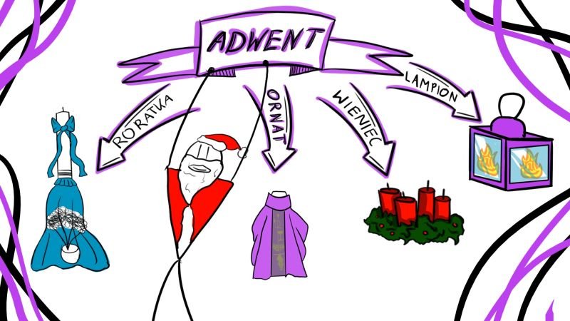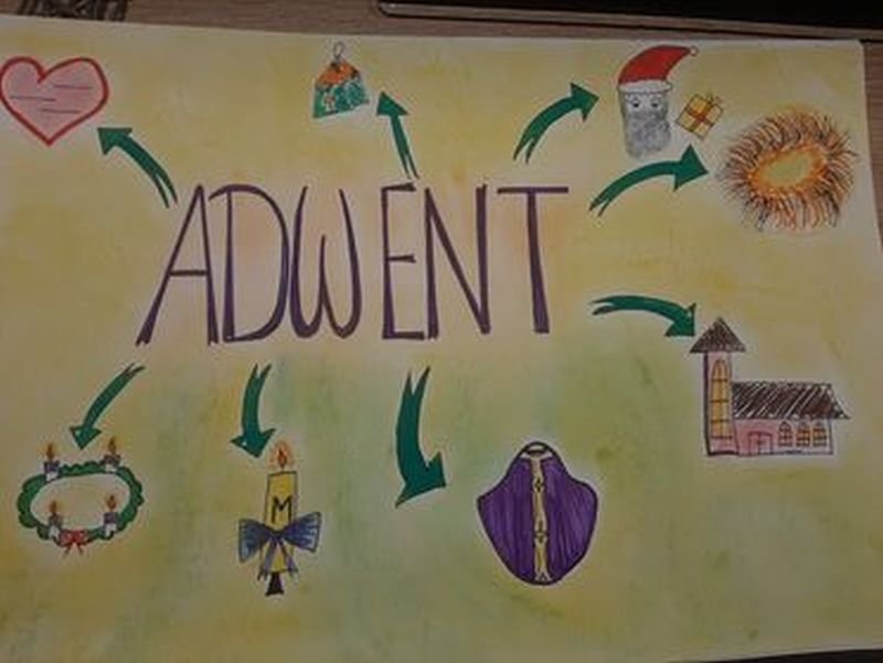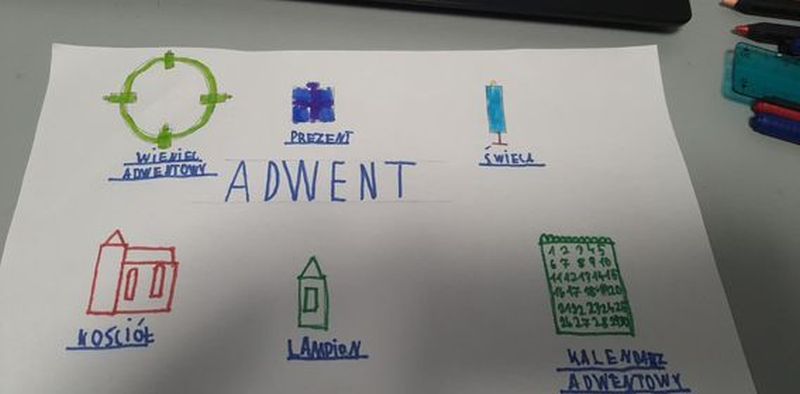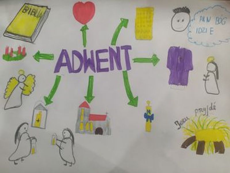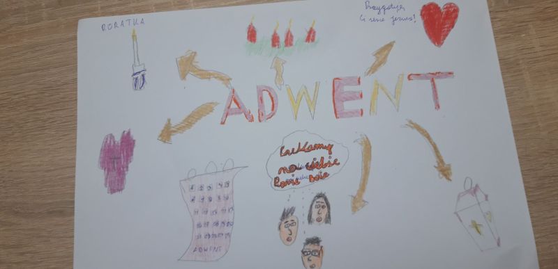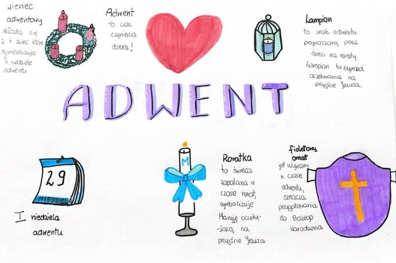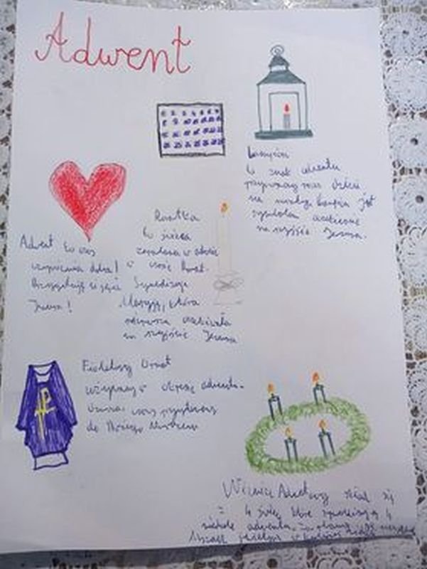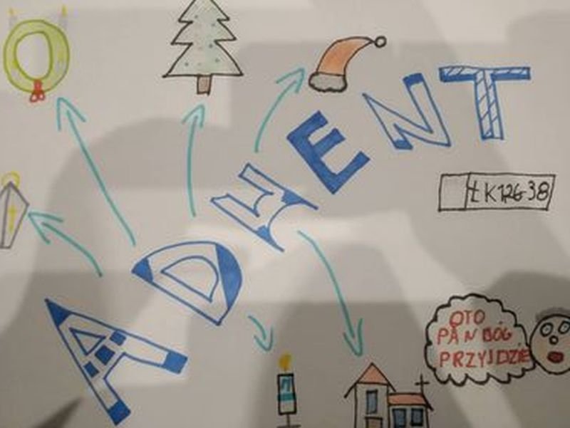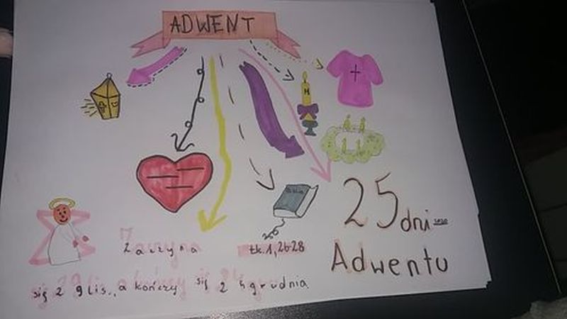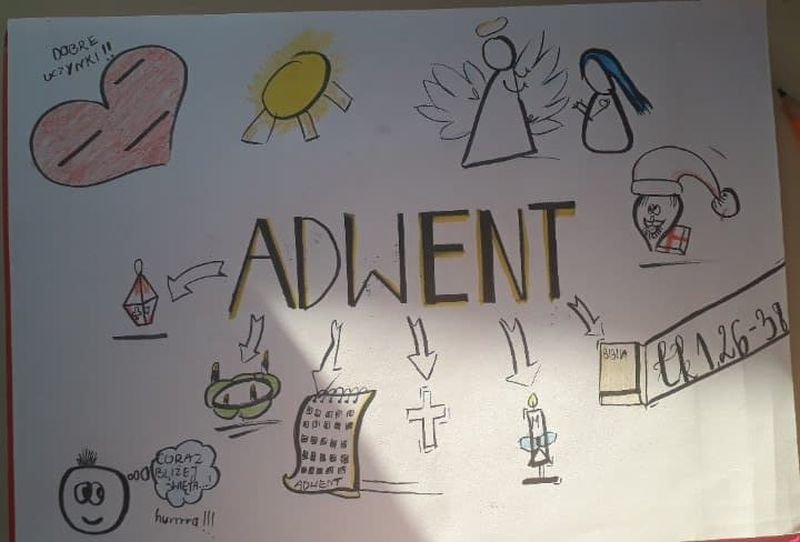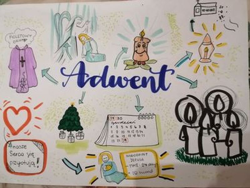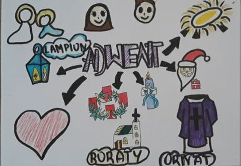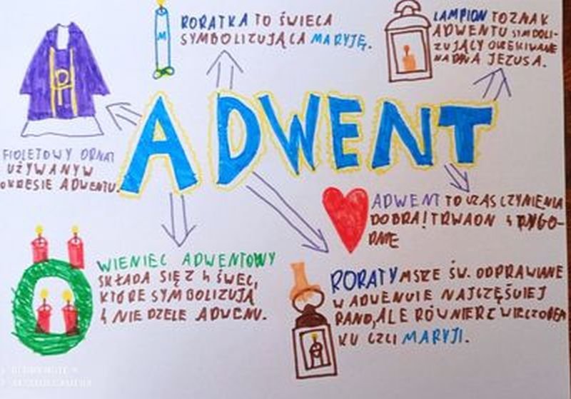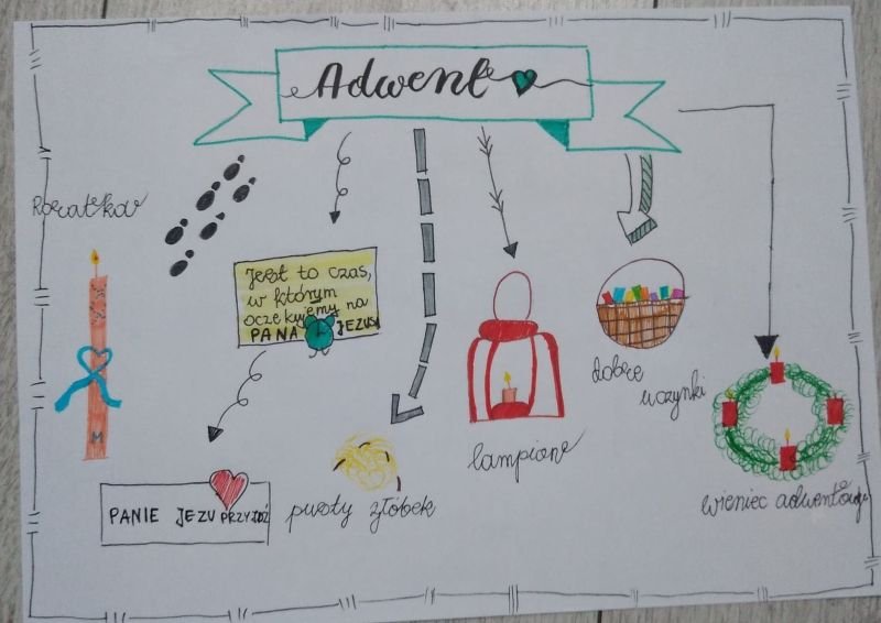 Rozpoczął się adwent – czas radosnego oczekiwania na przyjście Pana Jezusa. Kto z nas nie lubi tego czasu, w którym czuć już zapach piernikówi innych smakołyków. A wszyscy myślimy już o nadchodzących świętach no i oczywiście o prezentach. Aby dobrze przeżyć ten czas, który często przyćmiewają nam świąteczne reklamy, każda z klas jak co roku na katechezie przypomniała sobie, czym tak naprawdę jest adwent. Niewielu z nas chce o tym pamiętać, że każdy adwent przygotowuje nas na powtórne przyjście Jezusa na ziemię. Stąd potrzeba czujności i ciągłego bycia w gotowości na to spotkanie. Uczniowie przypomnieli sobie wszystkie znaki, które kojarzą się z adwentem. Dowiedzieli się też, że wraz z pierwszą niedzielą adwentu rozpoczyna się w Kościele tzw. nowy rok liturgiczny oraz, w jaki sposób dobrze przeżyć ten czas. W klasie 6a podsumowaniem takiej lekcji było sporządzenie notatki w formie graficznej.