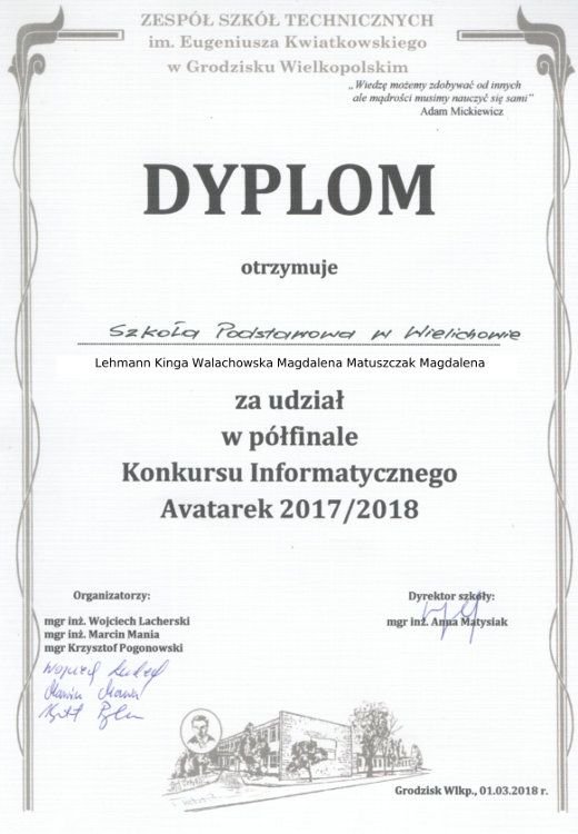 W dniu 1 marca br. miała miejsce kolejna już VII edycja Konkursu informatycznego Avatarek. Na tym etapie sprawdziło swoją wiedzę z zakresu szeroko pojętej informatyki na poziomie gimnazjalnym oraz w części wykraczającej po za podstawę programową gimnazjum 7 zespołów trzy osobowych. Udział wzięło gimnazjum z Granowa, Rakoniewic, Jabłonny, Strykowa, Wielichowa, Ptaszkowa i Grodziska Wielkopolskiego. Do rozwiązania był test, podobnie jak w eliminacjach, również za pośrednictwem platformy Moodle oraz 2 zadania praktyczne logiczno - programistyczne z którymi to uczniowie błyskawicznie sobie poradzili. I miejsce zajęli uczniowie ze Szkoły Podstawowej w Ptaszkowie. Na drugim miejscu znalazła się szkoła Podstawowa ze Strykowa, a na trzecim z Rakoniewic. Cała "trójka" zakwalifikowała się do ogólnopolskiego finału. Pozostali zajęli tzw. "czwarte" miejsce. Szkołę Podstawową w Wielichowie reprezentowała trójka uczniów: Kinga Lehmann(3a), Magdalena Walachowska(3c) oraz Magdalena Matuszczak(7a). Na zakończenie, wszyscy uczestnicy otrzymali dyplomy i nagrody, które wręczyła Pani Dyrektor Anna Matysiak wspólnie z Panem Starostą Sławomirem Górnym i organizatorami.