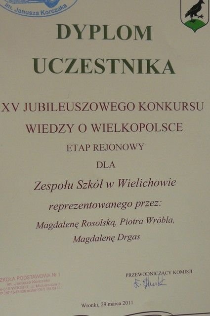 29 marca 2011 r. w Szkole Podstawowej nr 1 we Wronkach odbyła się jubileuszowa XV edycja Konkursu Wiedzy o Wielkopolsce. W tym etapie wzięło udział 82 uczniów z 24 szkół z różnych rejonów Wielkopolski - tutaj również udali się uczniowie Zespółu Szkół z Wielichowa.