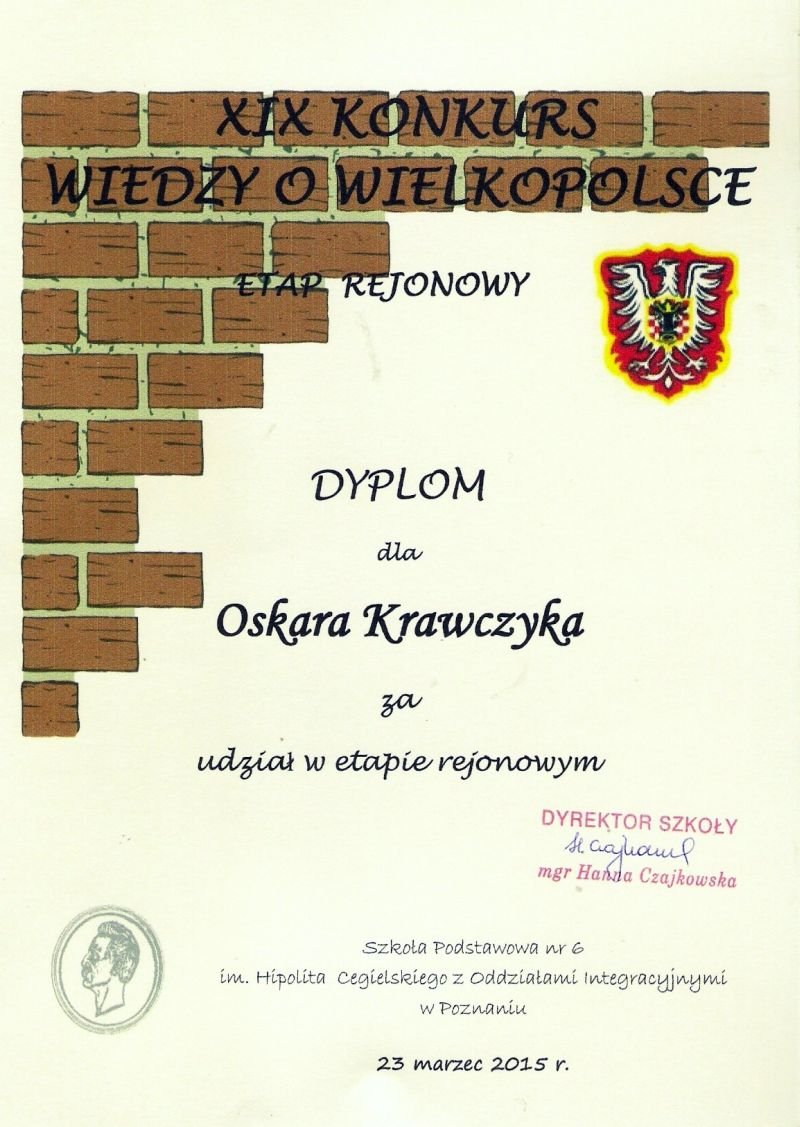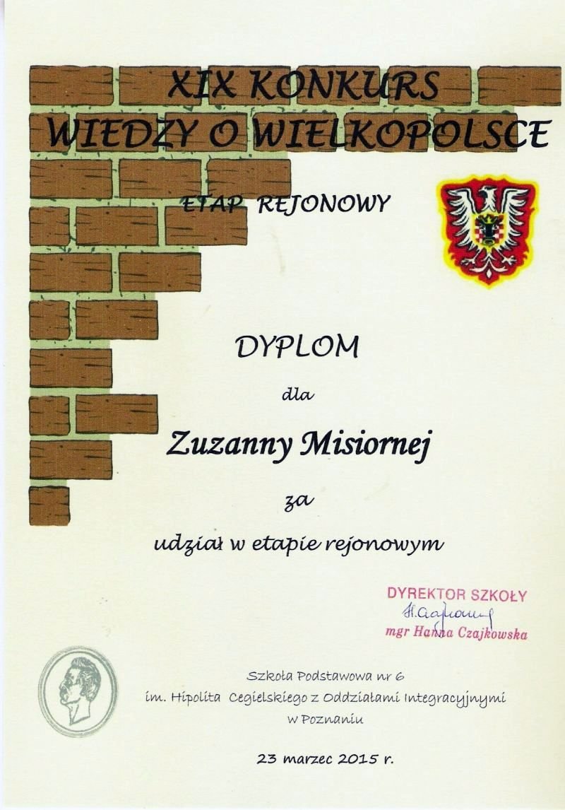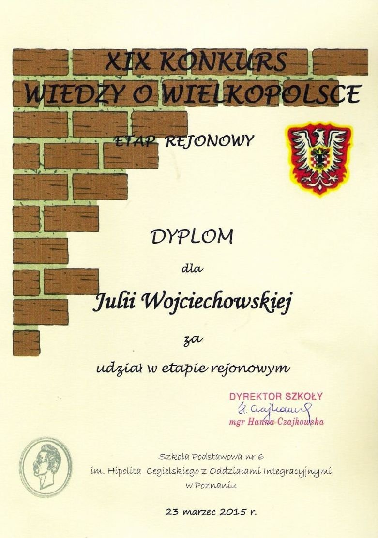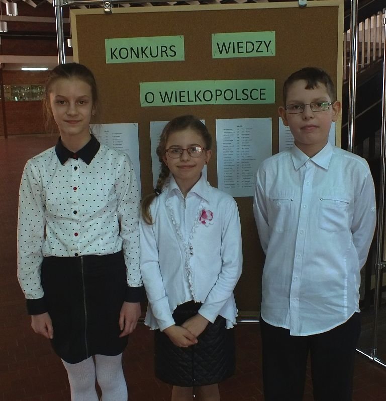 W poniedziałek 23 marca 2015 roku w sześciu szkołach w Wielkopolsce, czyli w: Damasławku, Golinie, Osiecznej, Śremie, Mikorzynie oraz w Poznaniu odbył się etap  rejonowy XIX Konkursu Wiedzy o Wielkopolsce. Uczestniczyli w nim uczniowie 33 powiatów, w tym również naszego, grodziskiego. Reprezentantami wielichowskiej szkoły byli laureaci etapu powiatowego, czyli Julia Wojciechowska, Zuzanna Misiorna i Oskar Krawczyk. Wraz z opiekunem udali się do Szkoły Podstawowej nr 6 im. Hipolita Cegielskiego w Poznaniu, by punktualnie o 13.00 wykazać się rozległą wiedzą na temat naszego regionu. Awans do ostatniego, wojewódzkiego etapu tego konkursu, zapewnił sobie każdy uczestnik, który uzyskał minimum 90% wymaganej liczby punktów.