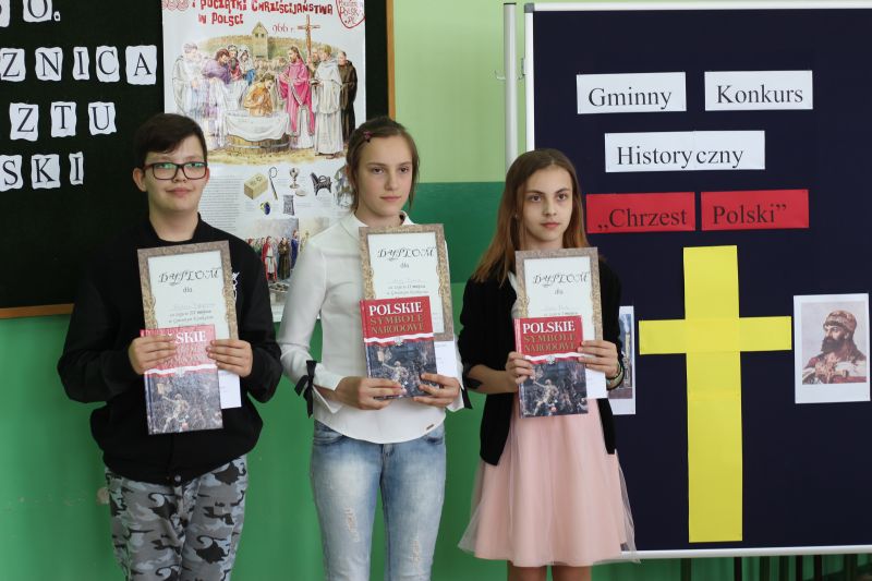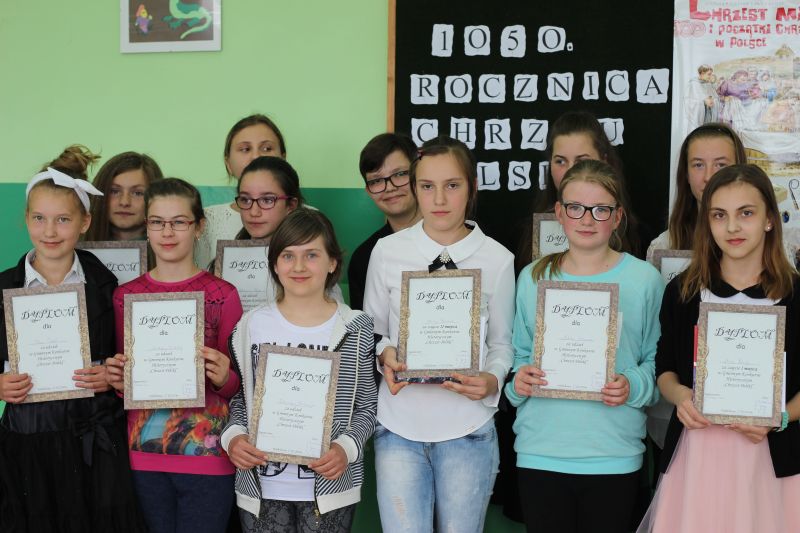 Dnia 17 maja w naszej szkole odbył się Gminny Konkurs Historyczny pt. „Chrzest Polski”. Wzięło w nim udział 12 uczniów (Tamara Szweda, Adriana Zając, Kinga Obiegała, Natalia Marciniak, Kajetan Przybylski, Wiktoria Rybicka, Kaja Śledź, Natalia Marciniak, Martyna Zarabska, Anna Banach, Maria Kocik, Katarzyna Stachowiak), którzy reprezentowali szkoły podstawowe: w Gradowicach, Łubnicy, Wilkowie Polskim i Wielichowie.
