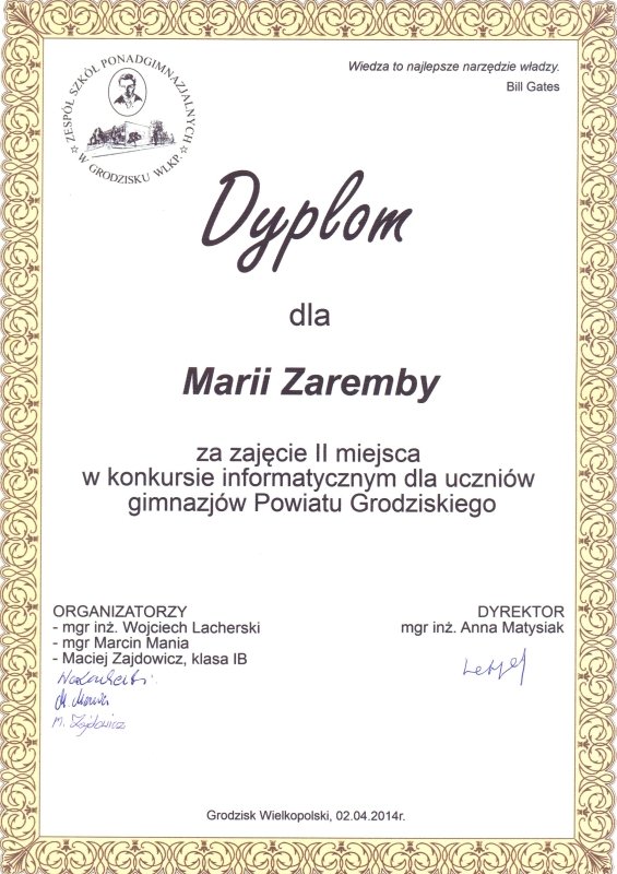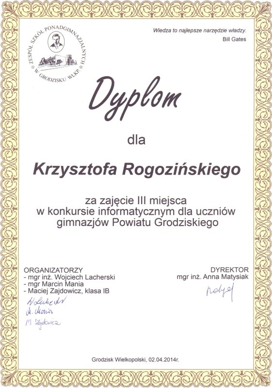 - Krzysztof Rogoziński – klasa III a III miejsce